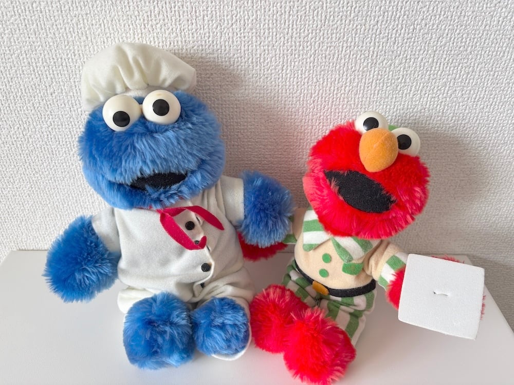 コックさんの格好をした、クッキーモンスターのぬいぐるみ。