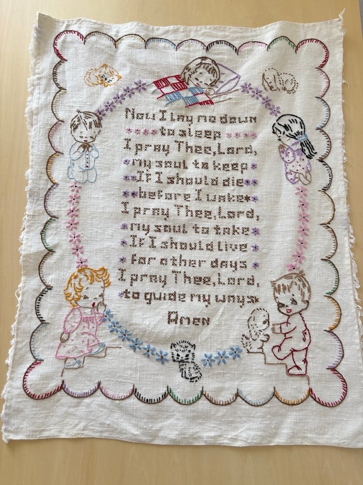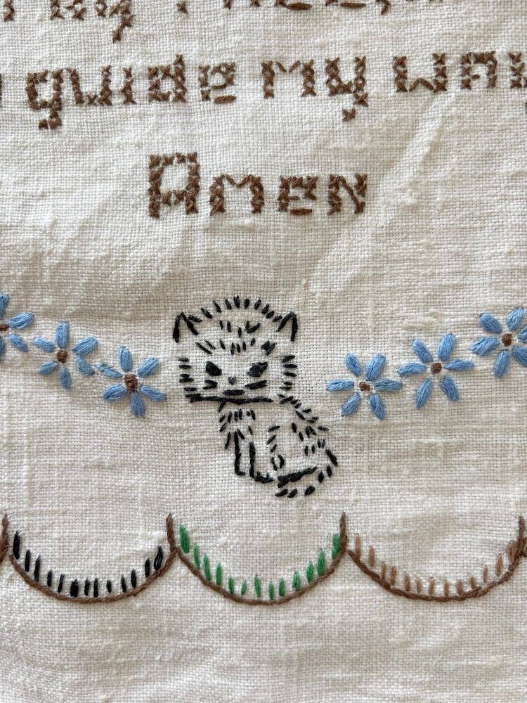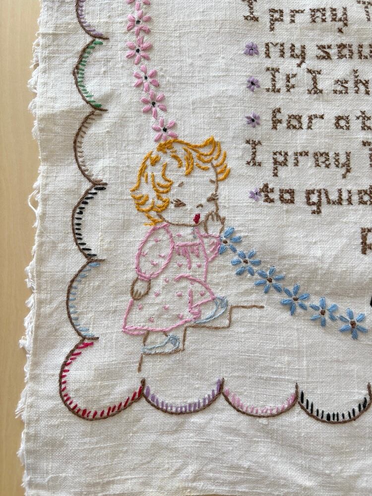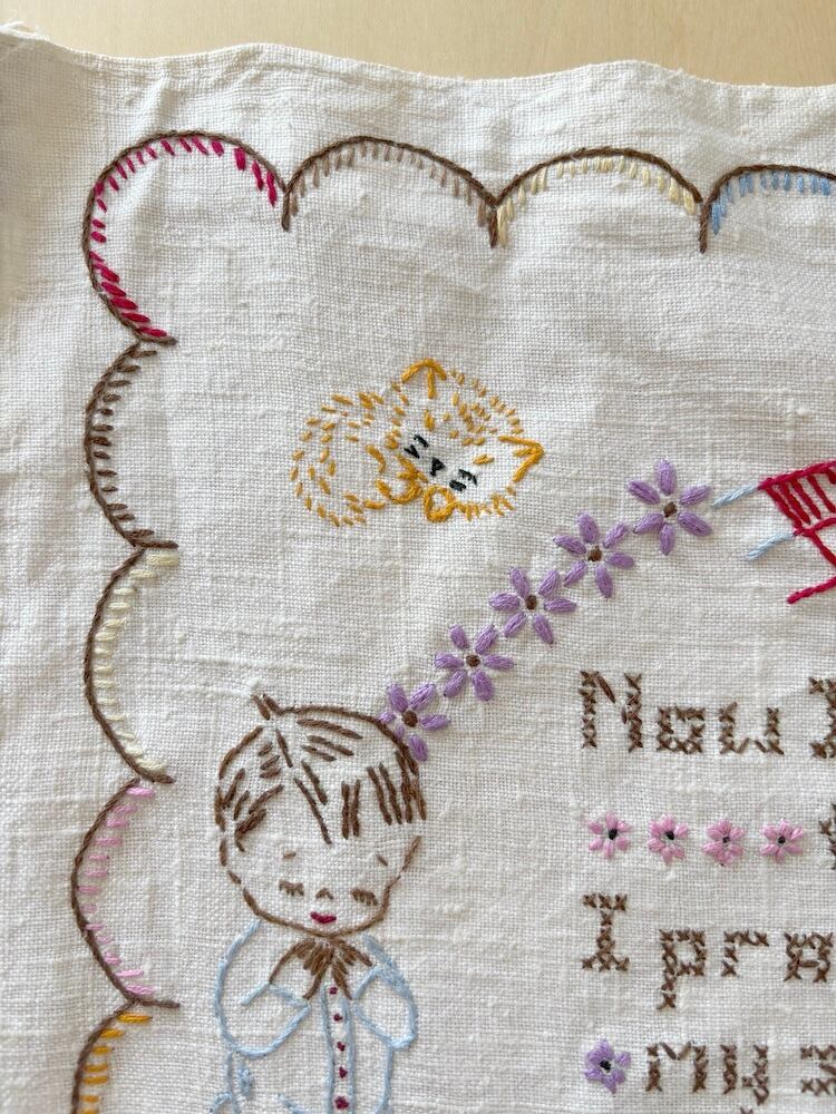 手刺繍のタペストリー / 祈る子供たちと猫と犬