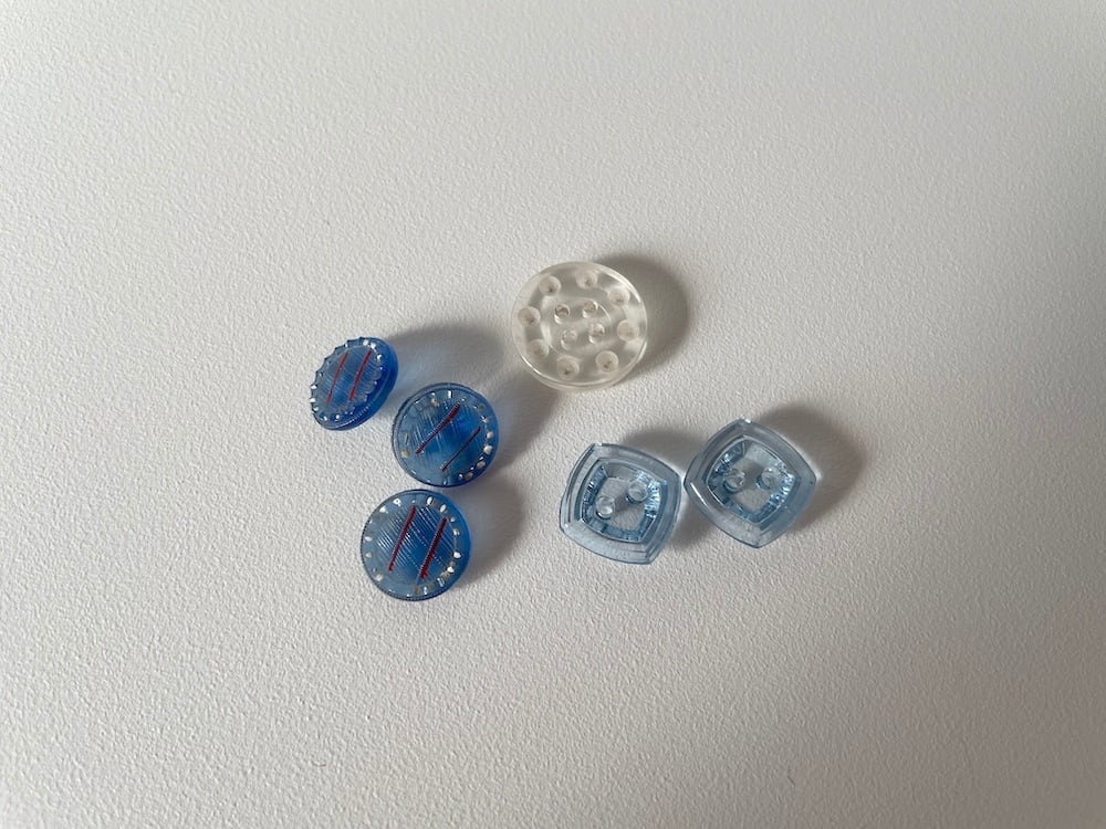 青い丸のボタンが個人的にとても気に入っているのですが、3の内、1つだけ足の部分が壊れているので、ボタンとしてはお使いいただけません。その代わり、アクセサリーなどに加工されてはいかがでしょうか??その他5つはボタンとしてお使いいただけます。