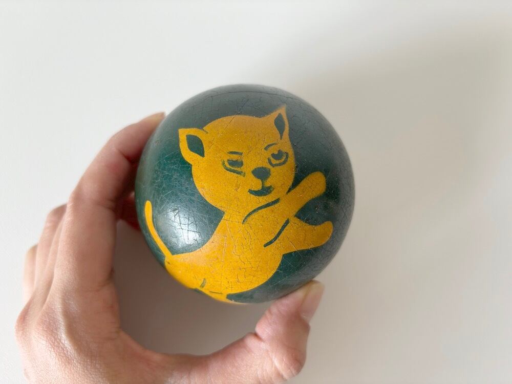 おそらく子供用のおもちゃのボール、でもイラストが甘すぎず、色も渋めなので、瓶などに入れて飾っても様になりそうです。