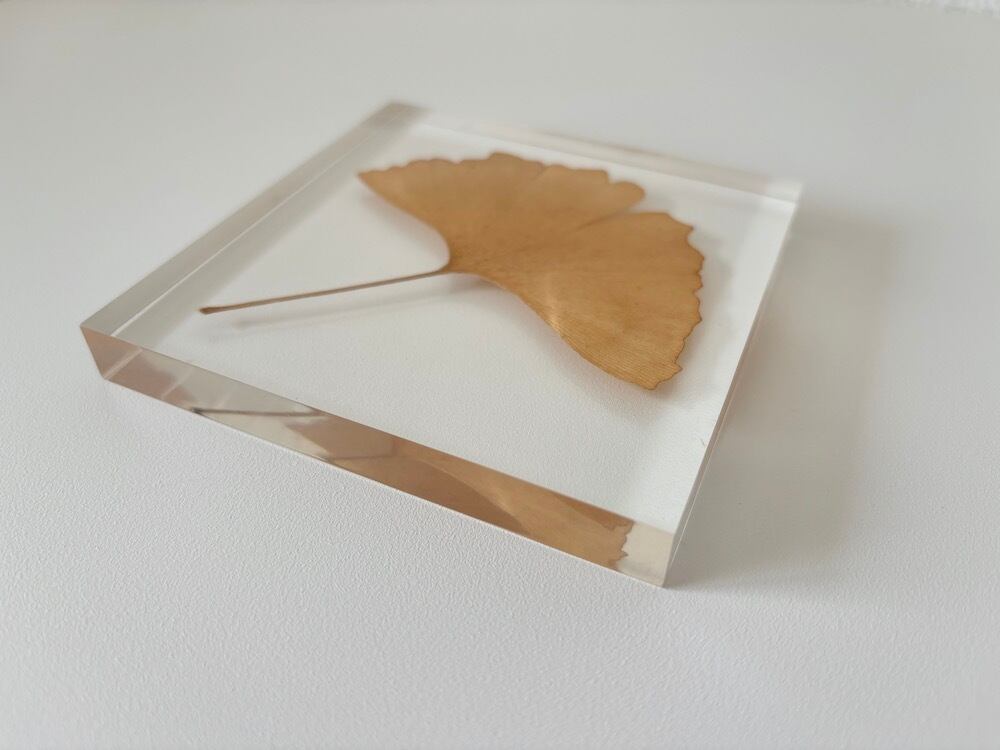 銀杏の色づいた葉がとても美しくて、アートピースとして飾るのはもちろん、少し軽めのペーパーウェイトとしても活躍してくれそうです。